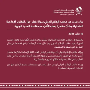 أصدر مكتب الإعلام الدولي بيانًا توضيحيًا ردًا على تقارير إعلامية متداولة بشأن مغادرة بعض الأفراد من قاعدة العديد الجوية، مؤكدًا أن هذه الإجراءات تأتي في سياق التوترات التي تشهدها المنطقة