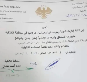 أصدر محافظ اللاذقية تعميماً إدارياً موجّهاً إلى مؤسسات الدولة الانتقالية في محافظة اللاذقية، يتضمّن منع وضع المكياج بشكل نهائي خلال الدوام الرسمي