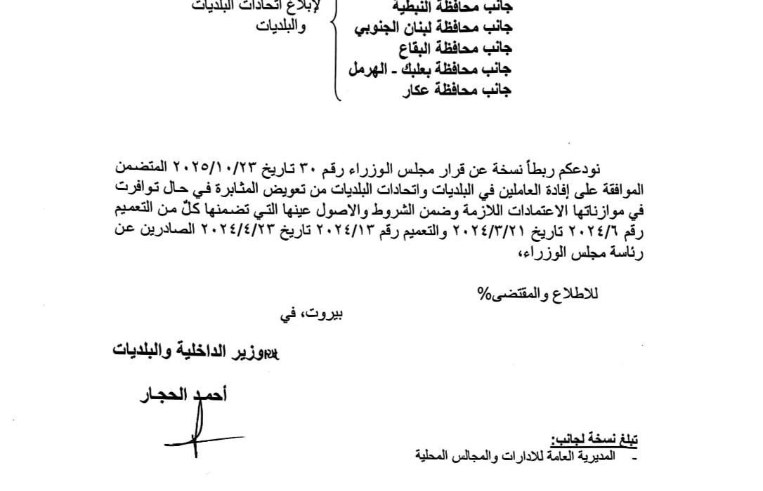 عمّمت وزارة الداخلية والبلديات الى المحافظين، من أجل إبلاغ اتحادات البلديات والبلديات، قرار مجلس الوزراء رقم 30 تاريخ 23/10/2025، القاضي بالموافقة على إفادة العاملين في البلديات واتحادات البلديات من تعويض المثابرة في حال توافر الاعتمادات اللازمة في موازناتها.