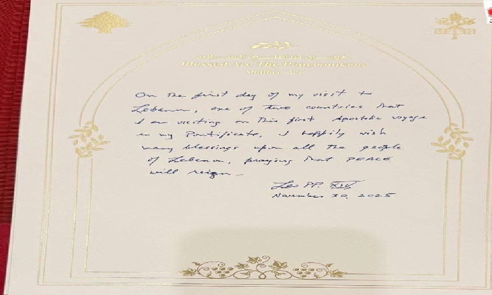 ترك البابا لاوون الرابع عشر، الأحد، رسالة في السجل الذهبي بالقصر الرئاسي في لبنان، عبّر فيها عن فرح زيارته الأولى إلى البلاد ضمن رحلته الرسولية.