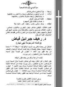 غيب الموت اليوم السيت 7 شباط 2026 ، الدكتور رهيف جبرائيل فياض والد وزير الطاقة والمياه الاسبق وليد فياض، وسط أجواء من الحزن خيّمت على العائلة والأقارب