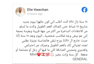 أعلن الإعلامي إيلي حوشان، أنّه أصبح “خارج الـ”otv”، ووجّه معايدة إلى الرئيس ميشال عون، بمناسبة عيد ميلاده.