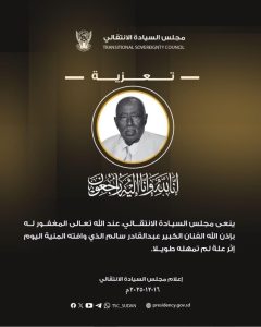 ونعى مجلس السيادة السوداني الفنان الراحل بعبارات كتب فيها:”ينعي مجلس السيادة الانتقالي عند الله تعالى المغفور له بإذن الله الفنان الكبير د. عبد القادر سالم الذي وافته المنية اليوم إثر علة لم تمهله طويلا”.